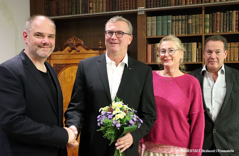 Am Mittwoch hat Oberbürgermeister Alexander Badrow den mit dem Verdienstkreuz am Bande ausgezeichneten Stralsunder Ulf Schwarzer gemeinsam mit dessen Frau im Rathaus empfangen. Zusammen mit dem 1. stellvertretenden Präsident der Bürgerschaft, Thomas Schulz, gratulierte er zu der Auszeichnung.