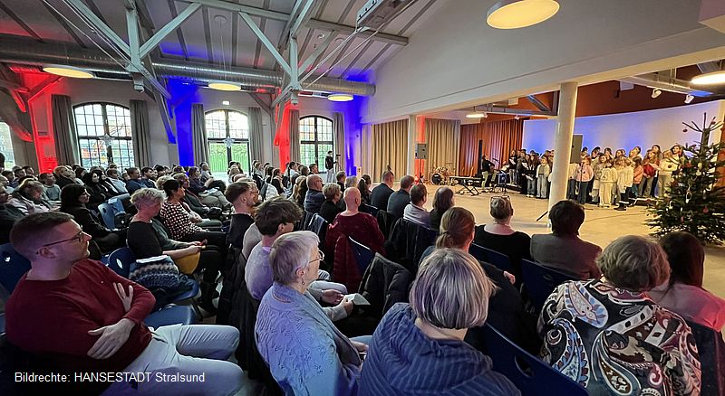Zum Abschluss konnte der Oberbürgermeister an alle, die bei der Eröffnung dabei waren, einen Adventskalender überreichen -  mit dem Motiv Campus am Sund von oben. Schließlich lud er alle Gäste zum gemeinsamen Adventssingen im Stadion der Freundschaft ein.
