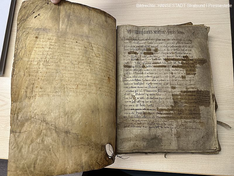 Um dieses wichtige Dokument auch für die Zukunft bestmöglich zu sichern, hat das Stadtarchiv der Hansestadt Stralsund das Stadtbuch von 1270 jetzt durch eine Firma aus Döbeln (Sachsen) aufwändig restaurieren lassen.
